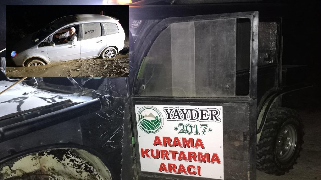 Yaptıkları çalışma sonrası mahsur kalan kişileri yangın kulesi mevkisinde tespit eden ekipler aracı saplandığı çamurdan çıkardı.